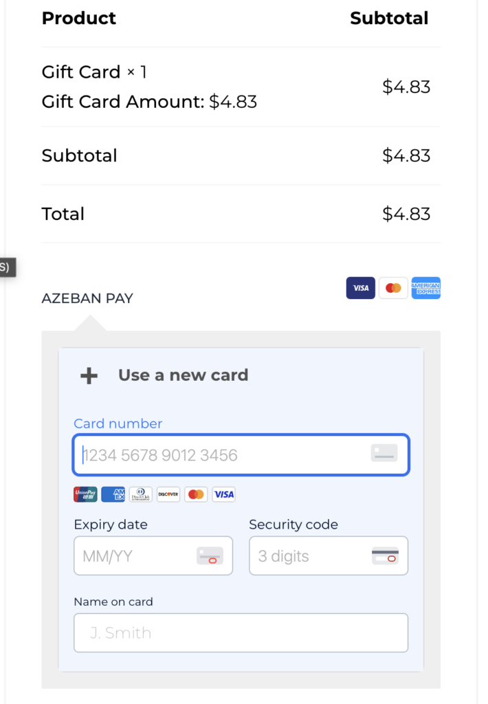 On the Azeban Pay page, you will notice that your purchase has been converted into a gift card transaction.