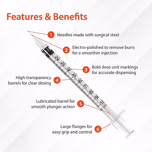 A high-quality, research-grade syringe designed for precision measurement in laboratory applications. Sterile and intended for accurate research purposes. Comes in packs of 10.